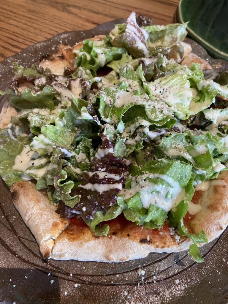 新鮮な野菜にクリーミーなドレッシングが絡んでいて、まさに“サラダとピザのいいとこ取り”。ヘルシーなのに食べごたえもあって、野菜好きにはたまりません。